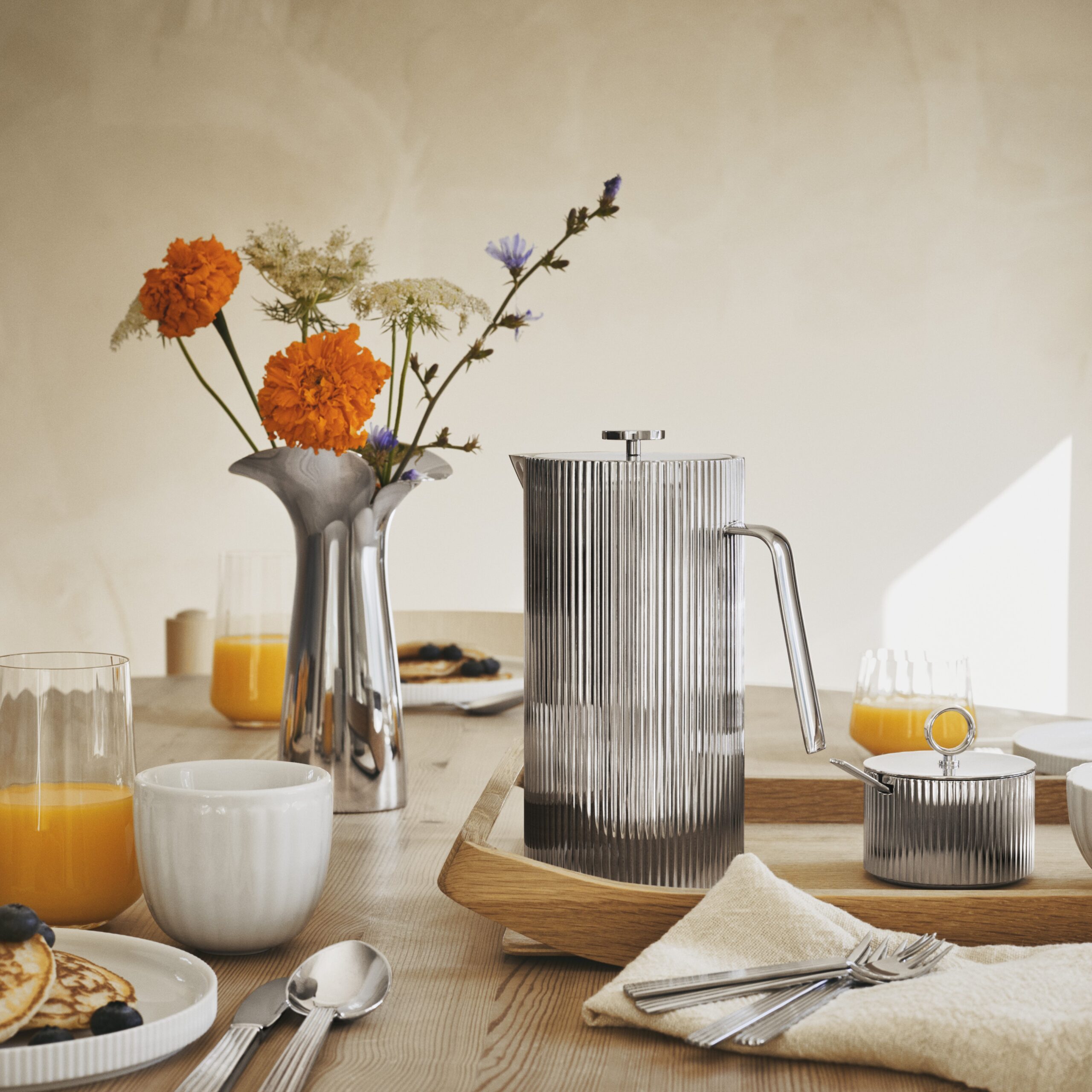 Den karakteristiske og elegante rillede overflade på Bernadotte-kollektionens franske stempelkande giver bordet et umiskendeligt strejf af art deco.