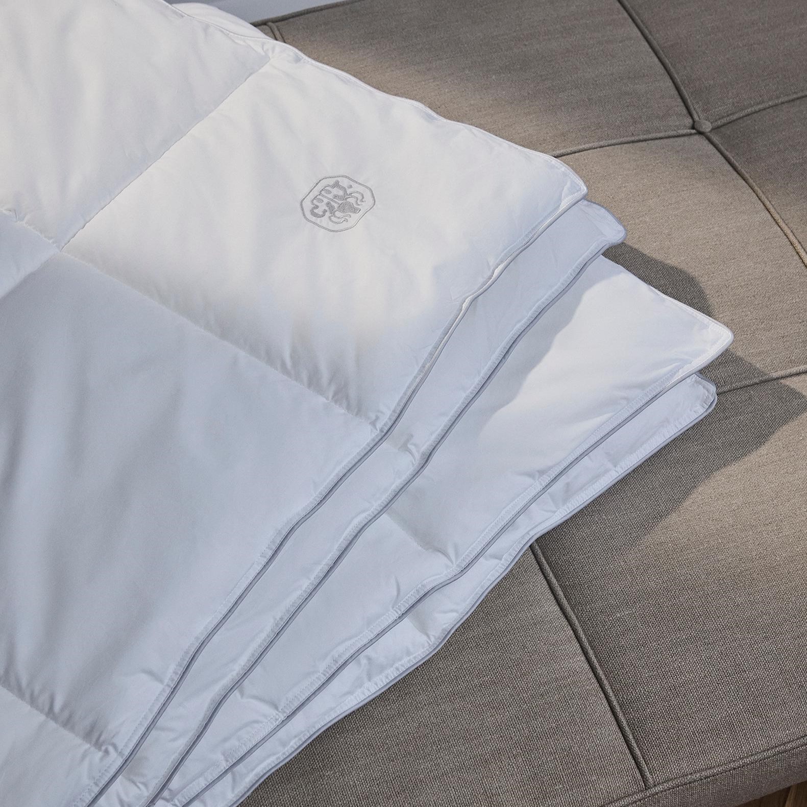 De opspundne, lange fibre griber ind i hinanden og sikrer en optimal ventilation. Fibrene giver dynen en god spændstighed, så den tilpasser sig og omslutter kroppen. Dynen bærer Georg Jensen Damasks ikoniske logo som et diskret broderi – et symbol på kvalitet og omhyggelighed.