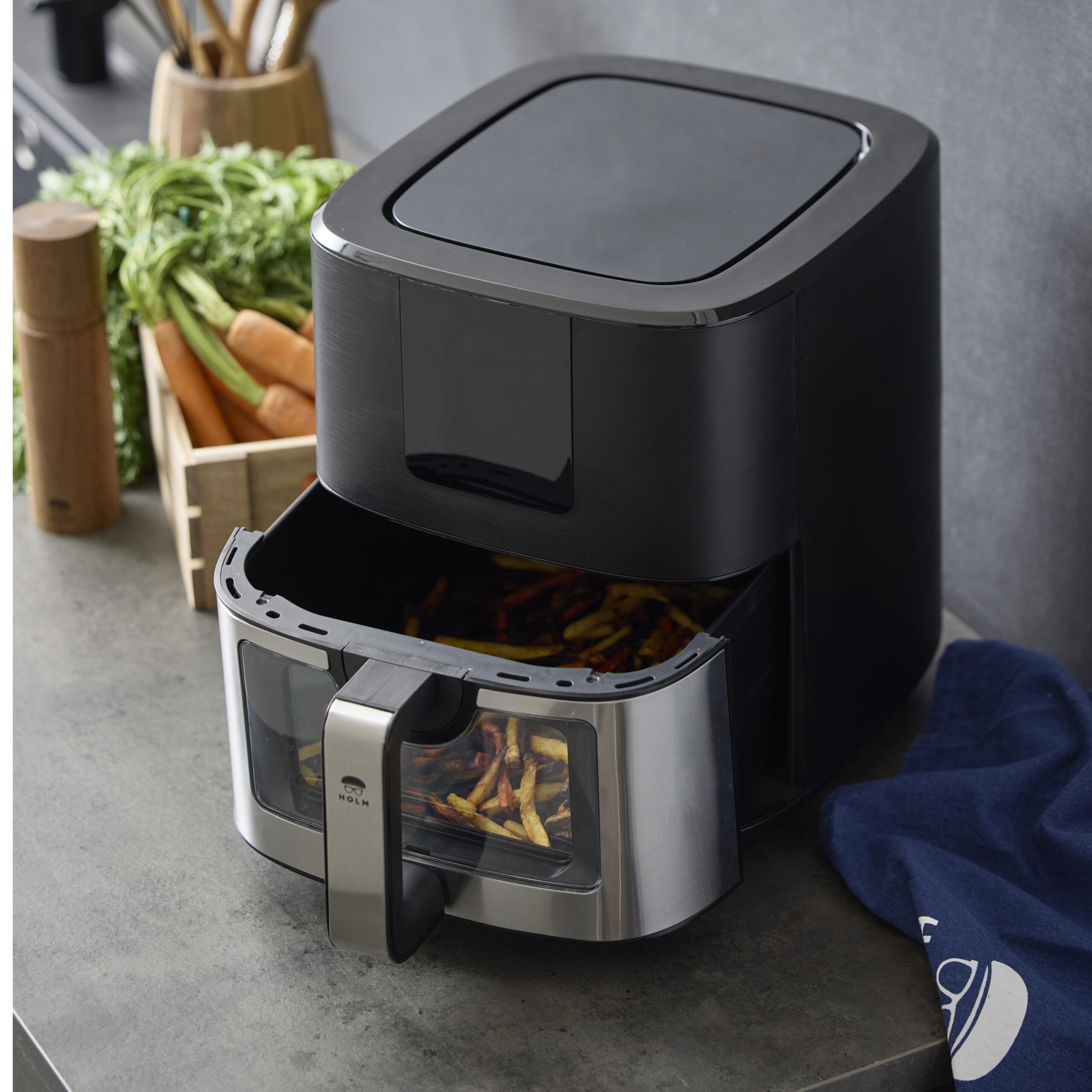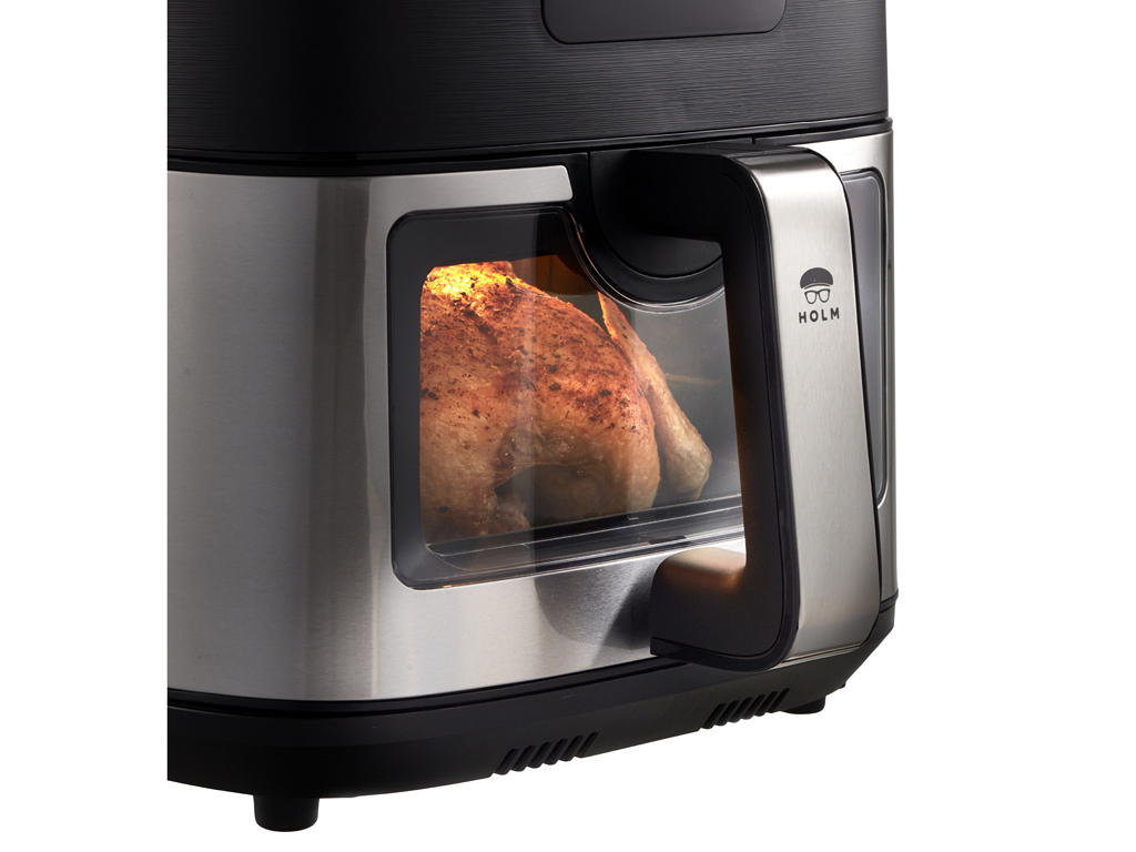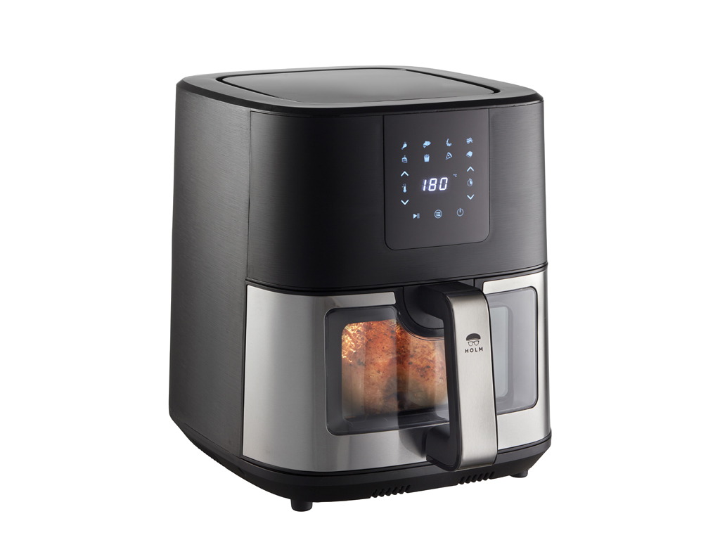 Airfryer med vindue, 9 liter. I en airfryer tilberedes maden med cirkulerende varm luft i stedet for fritureolie, og fritterne får sprød og crispy overflade helt uden eller med meget små mængder olie.