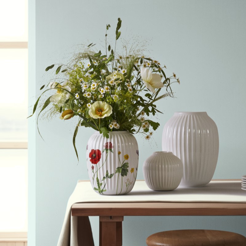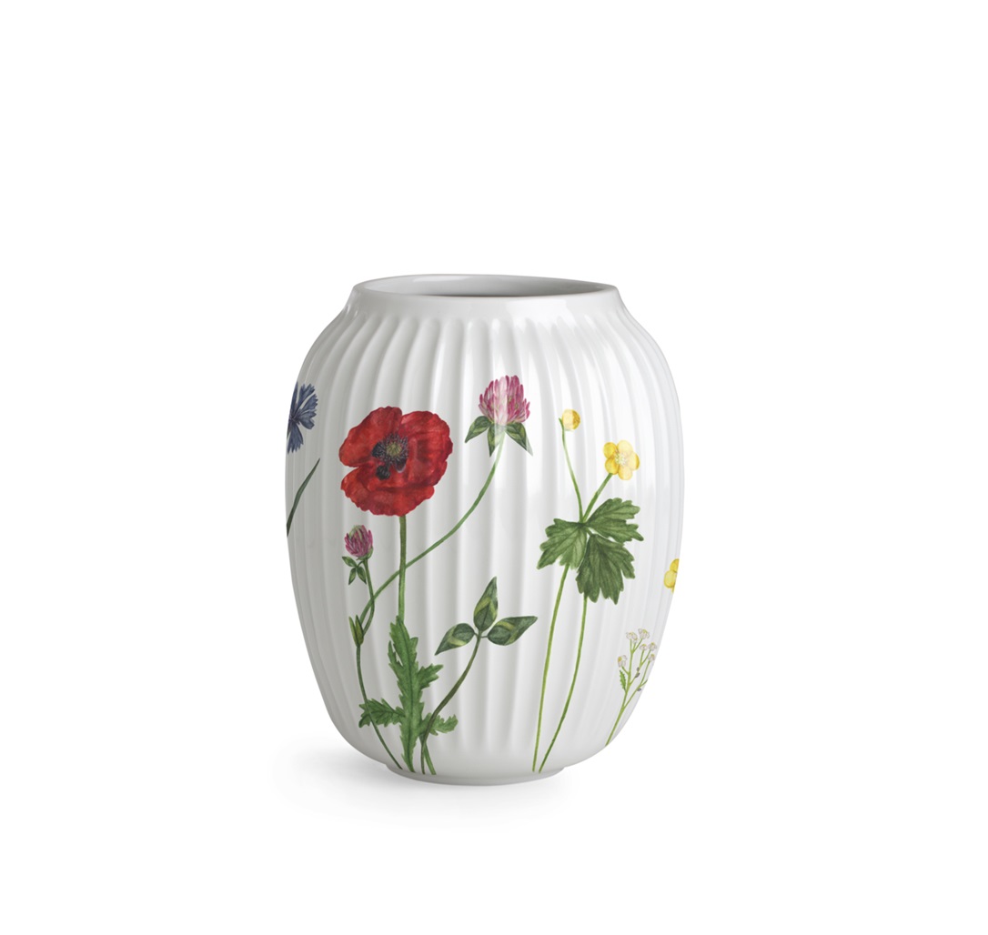 Nyhed! Hammershøi Summer-vasen prydet med engblomsttemaet måler 21 cm i højden og er umulig at komme udenom – både når det drejer sig om de farverige Hammershøi Summer-dekorationer af vilde engblomster, og de blomster du selv plukker.