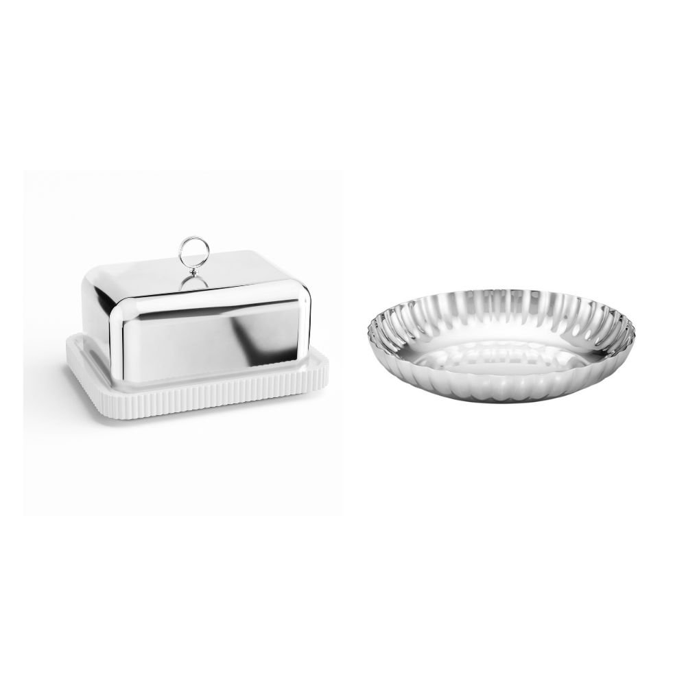 Denne smørskål i rustfrit stål og porcelæn fornyer et klassisk stykke køkkentilbehør med sit elegante design.