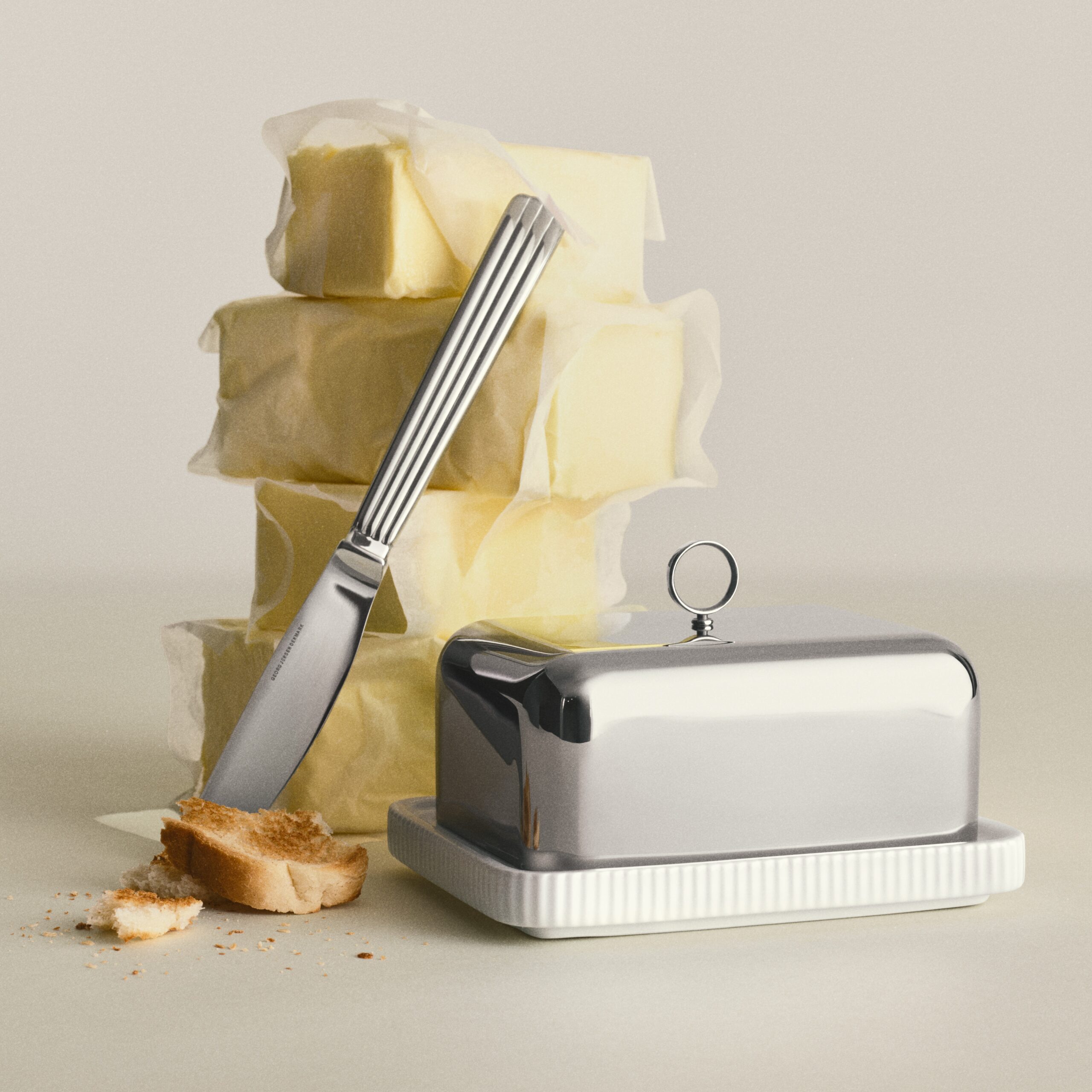 Smørskålen er en del af den populære Bernadotte kollektion med designs af svenske Sigvard Bernadotte, som begyndte at samarbejde med Georg Jensen i 1930’erne.