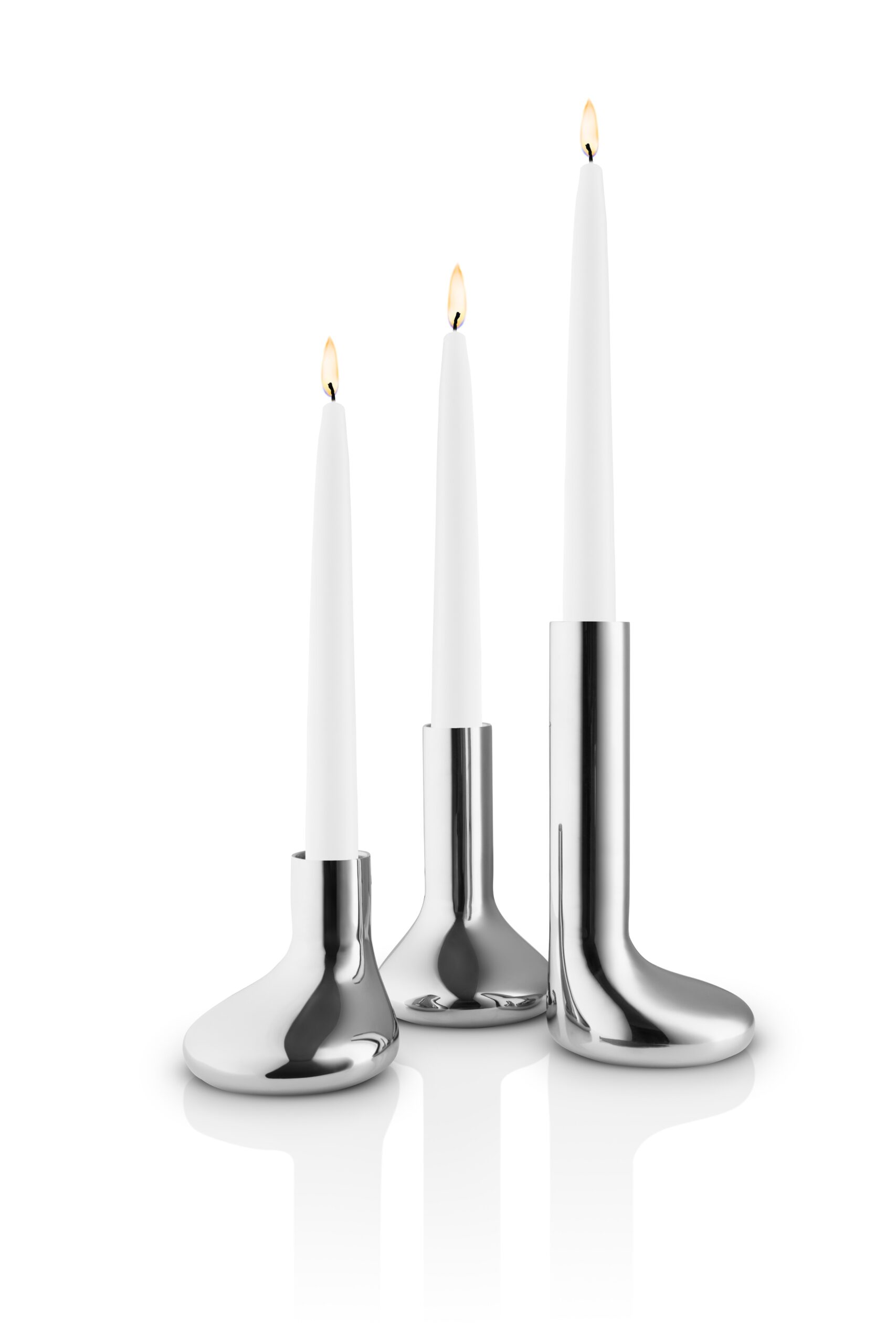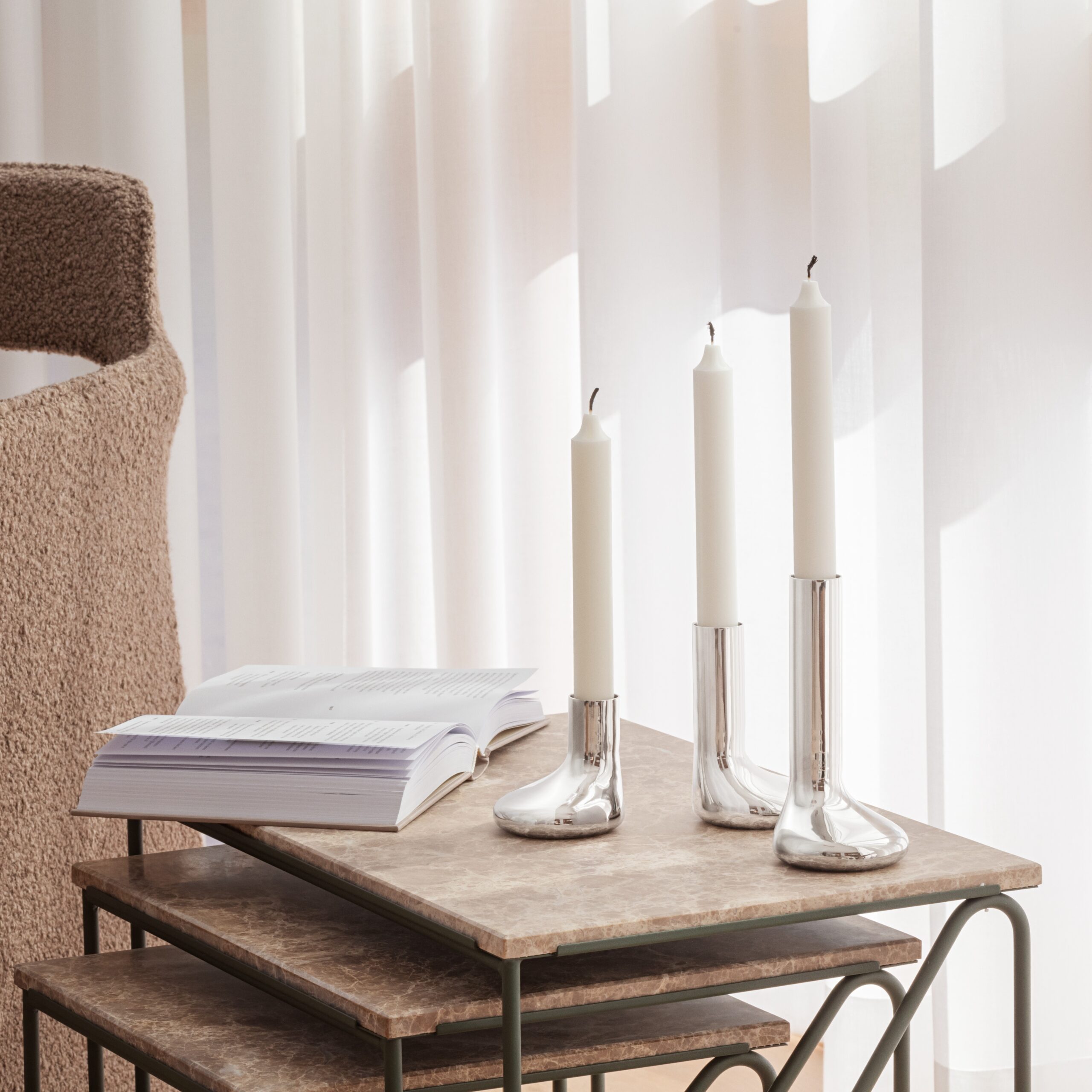 Mellow lysestagerne leger med kontraster. Stålens rå styrke møder bløde, næsten flydende former, inspireret