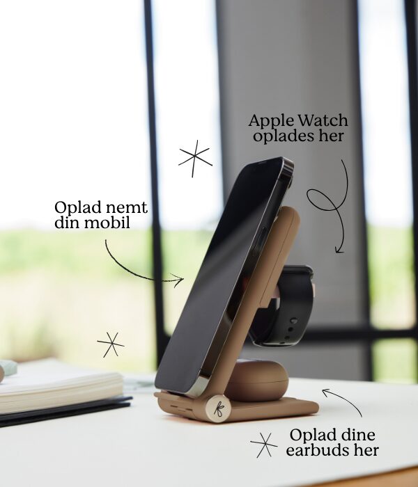 Oplad dem trådløst på reCHARGE+, en stilfuld oplader, der hurtigt oplader både dine kompatible høretelefoner, mobil og Apple Watch samtidigt. Med hurtig opladning på 15W på fronten og to opladezoner bagtil er den både effektiv og praktisk.