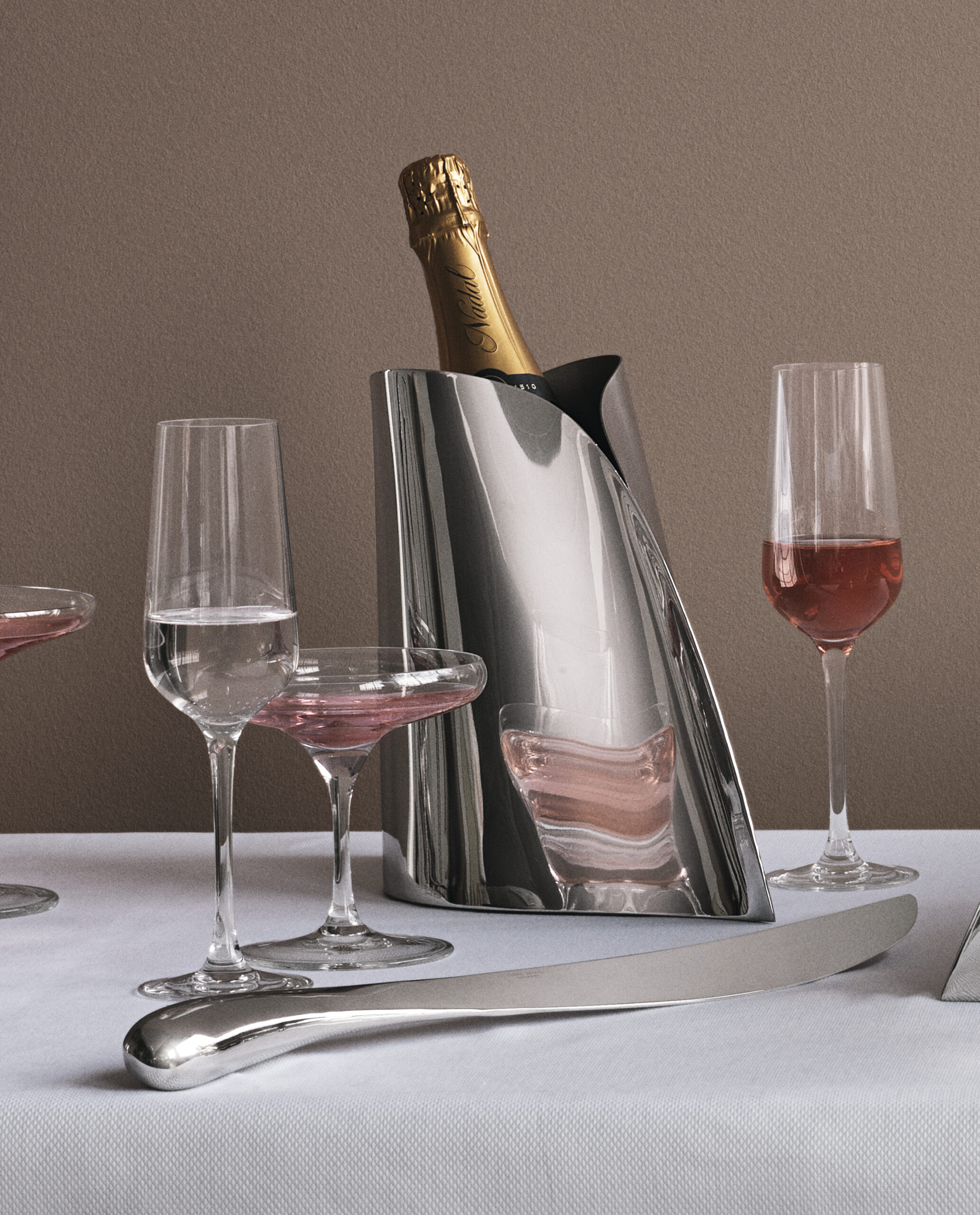 Champagnesablen Indulgence fra Georg Jensen er udført i glaspoleret rustfrit stål. Dens klinge er ikke skarp og fuldstændig harmløs. Det er således ikke et skarpt blad, men kraften fra sablen der skiller flasken i to stykker.